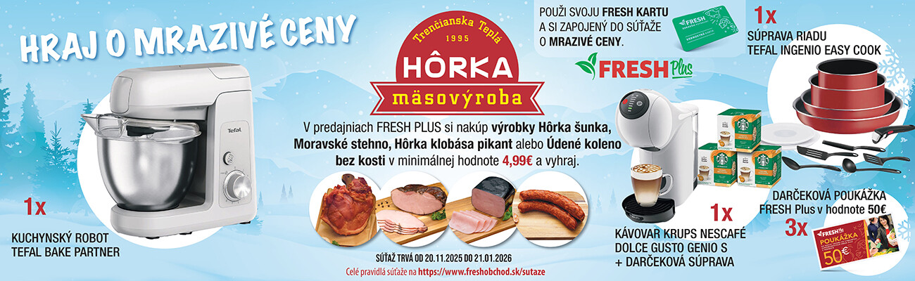 Zákúpením ľubovoľného výrobku a to: Hôrka šunka, Moravské stehno, Hôrka klobása pikant, Údené koleno bez kosti o ľubovoľnej váhe od spoločnosti Hôrka s.r.o. v minimálnej hodnote 4,99€ s DPH v potravinách FRESH Plus ste automatický v hre pri použití FRESH vernostnej karty!
